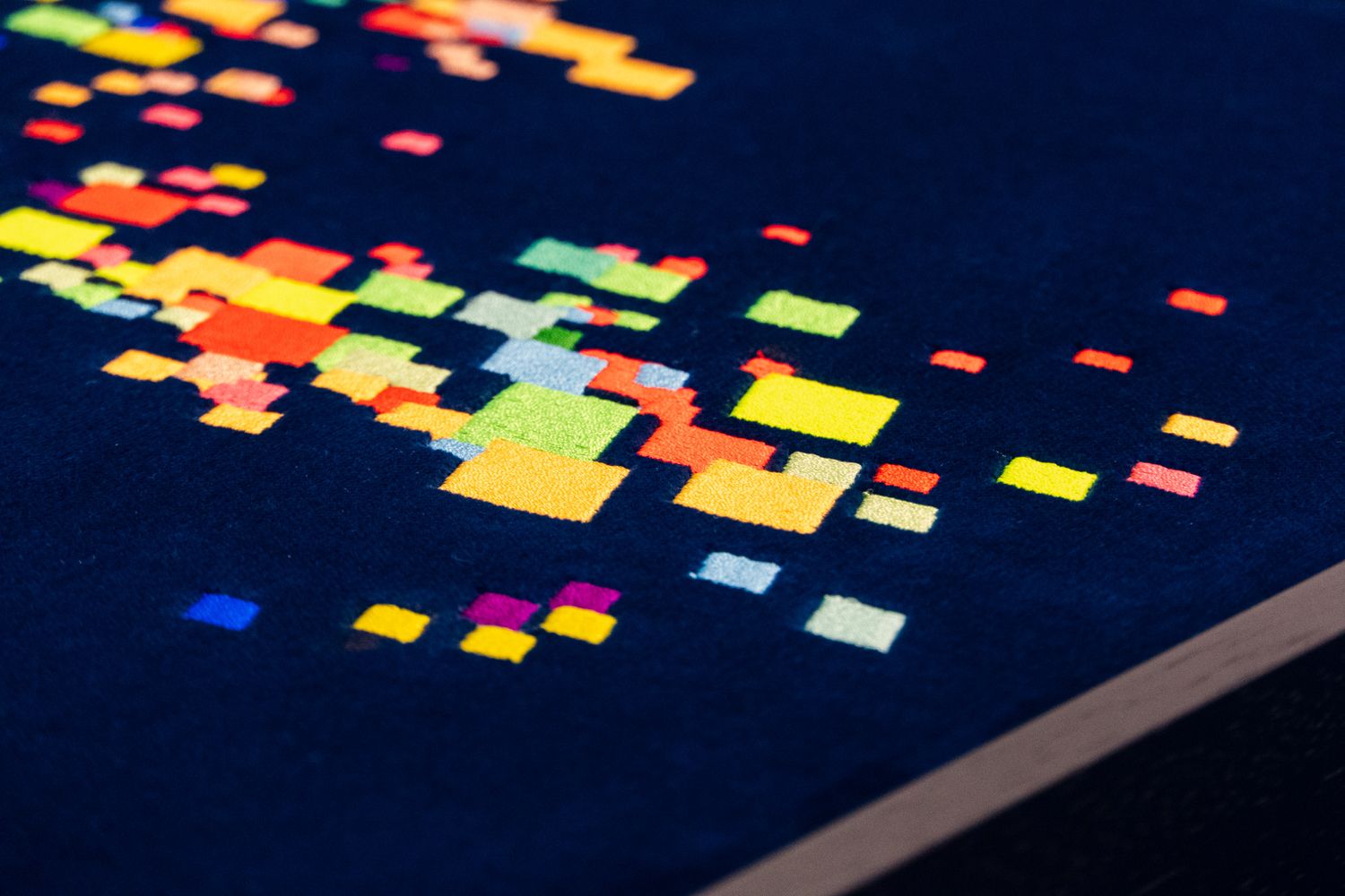 Cette création réalisée à l’aide d’une brodeuse numérique, traduit un dessin issu d’une création digitale inédite de l’artiste. Des pixels colorés, de tailles et d’intensités variables, semblent flotter dans l’espace, dessinant une perspective vibrante et poétique.